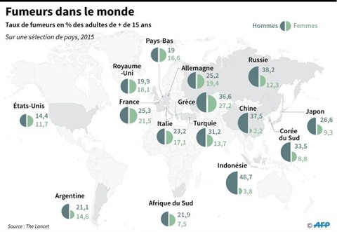 Un homme sur quatre et une femme sur 20 étaient des fumeurs quotidiens en 2015, soit près d'un milliard, selon le rapport Global Burden of Diseases, établi par un consortium de centaines de scientifiques.