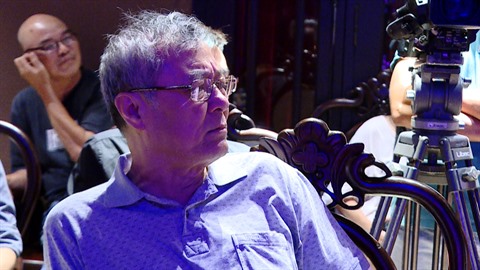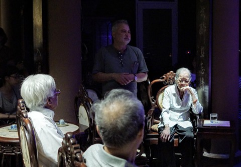 | Le fondateur et directeur du théâtre Phù Sa, Nguyên Nhât Ly (debout), prend la parole lors de l’ouverture de la table ronde "Le ca trù - les histoires inexpérimentées", le 10 juin à Phù Sa Lab. |