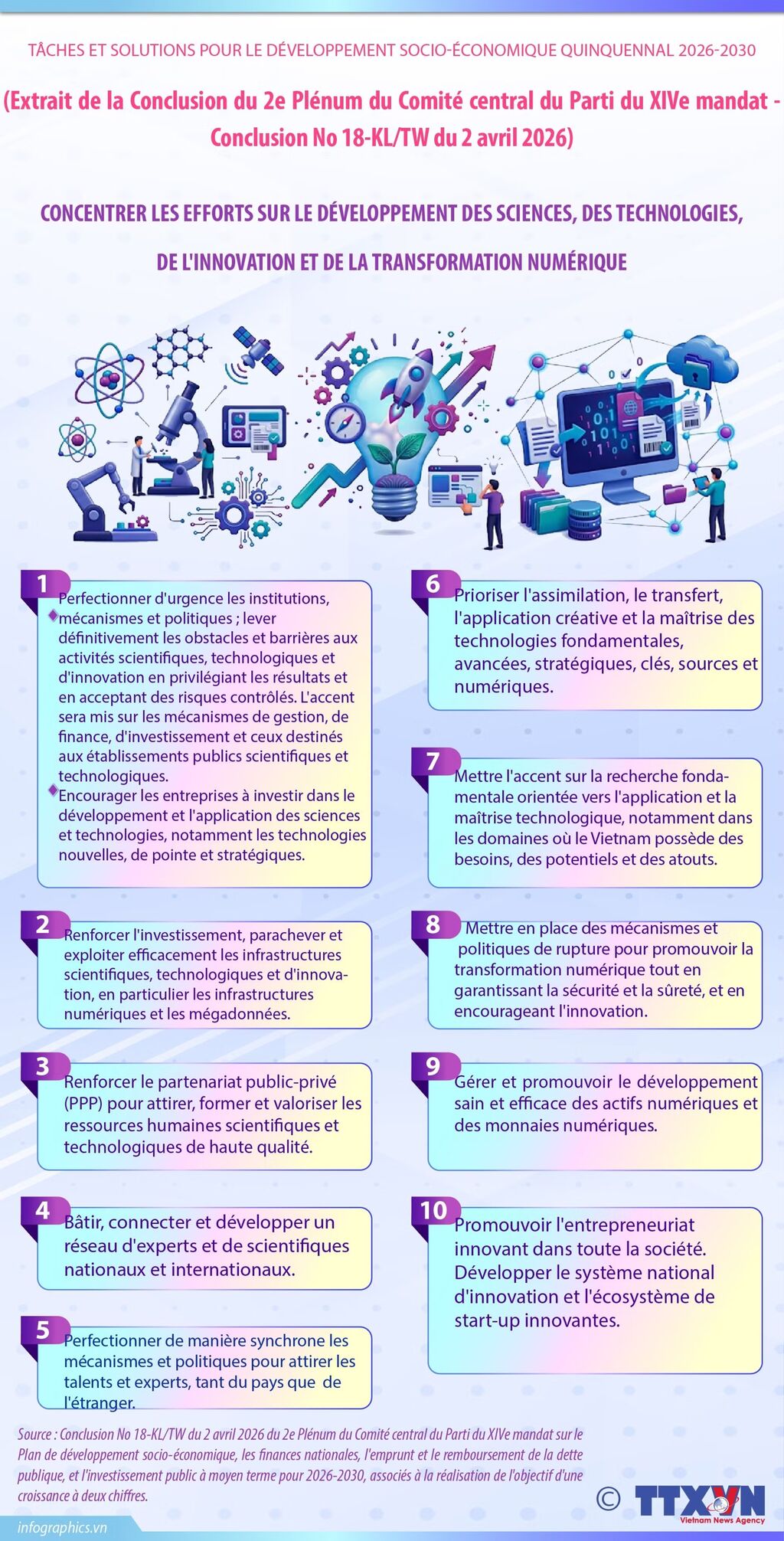 Au nom du Comité central du Parti communiste du Vietnam, le secrétaire général Tô Lâm a signé la Conclusion N°18-KL/TW du 2 avril 2026, issue du 2e plénum du Comité central du Parti du XIVe mandat, portant sur le plan de développement socio-économique, les finances nationales, la gestion de la dette publique ainsi que les investissements publics à moyen terme pour la période 2026-2030, en lien avec l’objectif de croissance à deux chiffres.