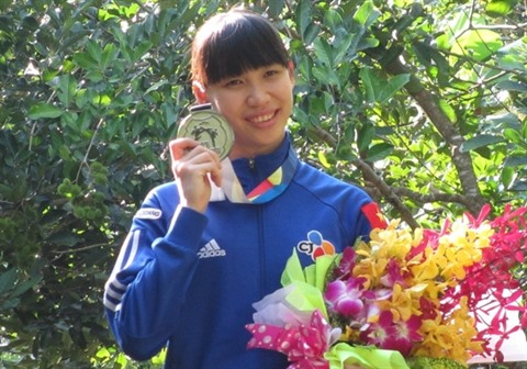 | Kim Tuyên sur la plus haute marche du podium des Championnats de taekwondo d’Asie disputés du 14 au 18 juin au Liban. |