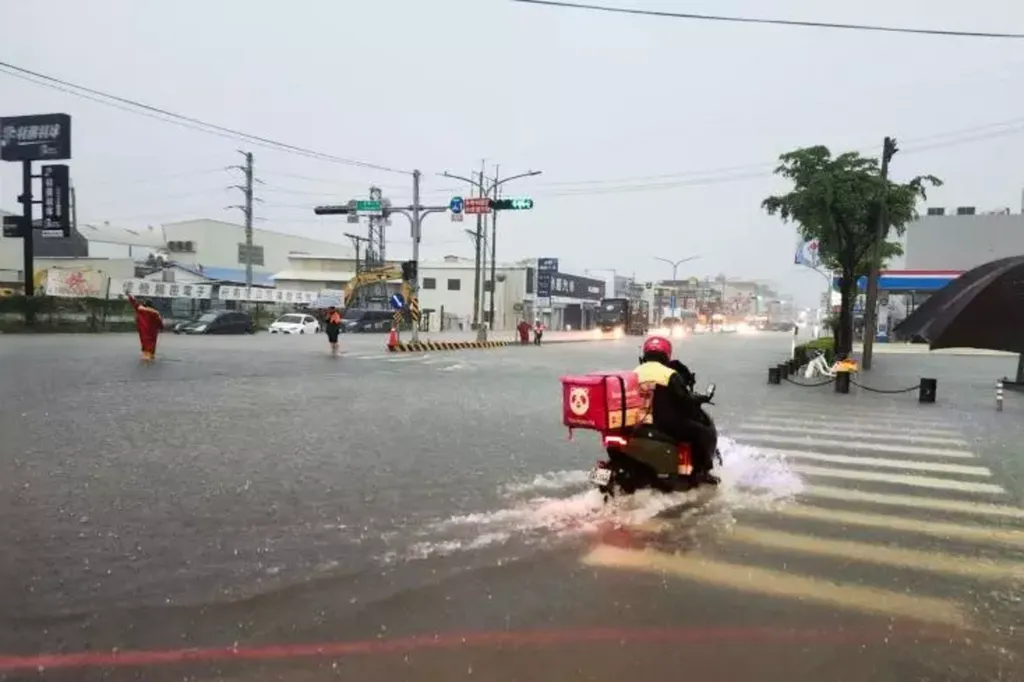 | Un livreur à scooter qui traverse une intersection inondée à Tainan sur l'île de Taïwan, le 2 août. |