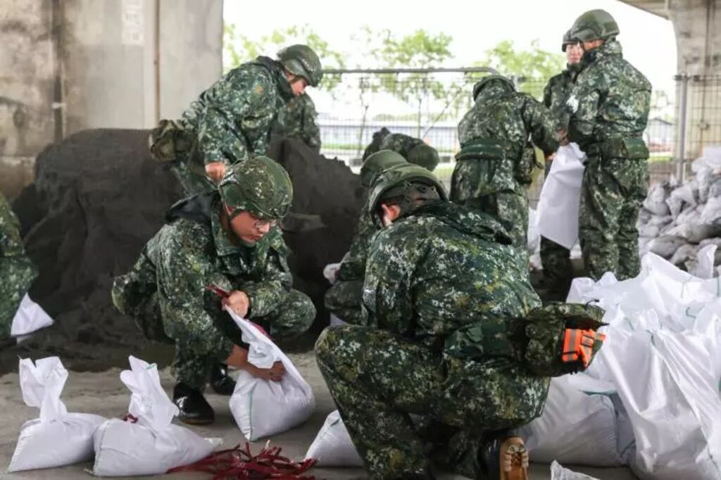 | Des militaires taïwanais préparent des sacs de sable alors que le typhon Kong-rey s'approche de Taïwan (Chine), dans le comté de Yilan, le 30 octobre. |