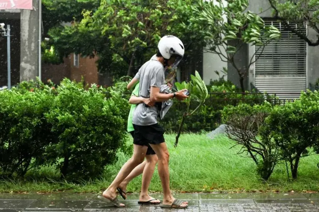 | Des personnes marchent avec des casques dans les rues de Kaohsiung après le passage du typhon à Taïwan le 13 août. |