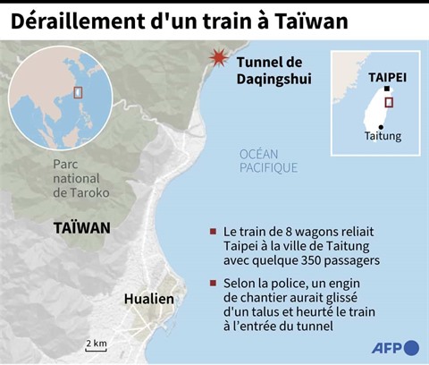Selon les autorités, l'accident a été causé par un engin de chantier qui, après avoir glissé d'un talus, a heurté le train qui s'apprêtait à entrer sous un tunnel près de la ville de Hualien, sur le littoral.