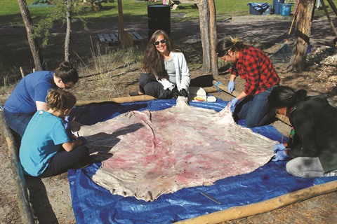| Les visiteurs et les membres de Dene Nahjo traitent une peau dans un camp à Yellowknife, dans les Territoires du Nord-Ouest au Canada. |