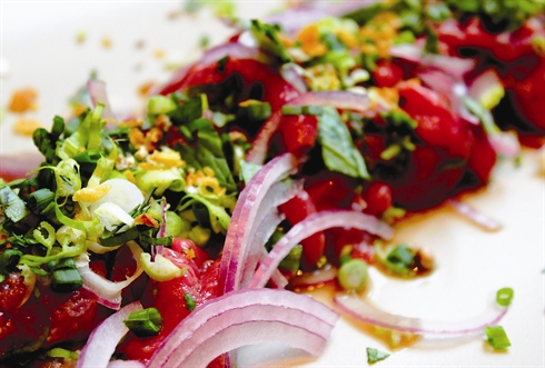 - Ciseler également très finement le ngo gai, le basilic et l’oignon rouge.