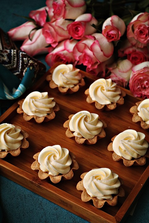 - Utiliser une poche à douille pour donner une forme à la crème au fromage sur la surface des tartelettes. Servir froid, en dessert.
