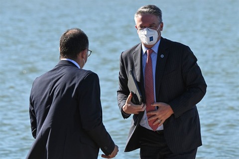 | Le secrétaire général de l'OCDE, Mathias Cormann (droite), arrive au Sommet du G20 Finances à Venise, le 9 juillet. |