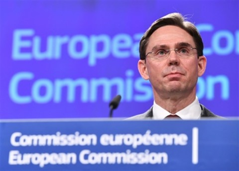 | Le vice-président de la Commission européenne, Jyrki Katainen, lors d'une conférence de presse sur les taxes américaines sur l'acier et l'aluminium, le 9 mars à Bruxelles. |