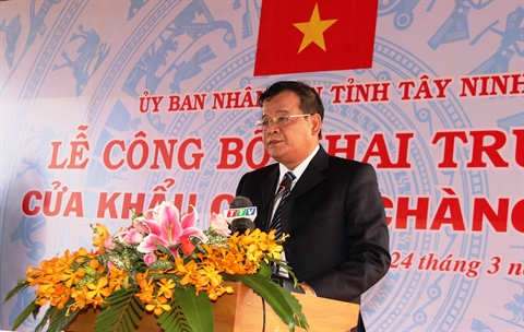 | Le président du Comité populaire de la province de Tây Ninh, Pham Van Tân, annonce l'inauguration de la porte frontière principale de Chang Riêc. |