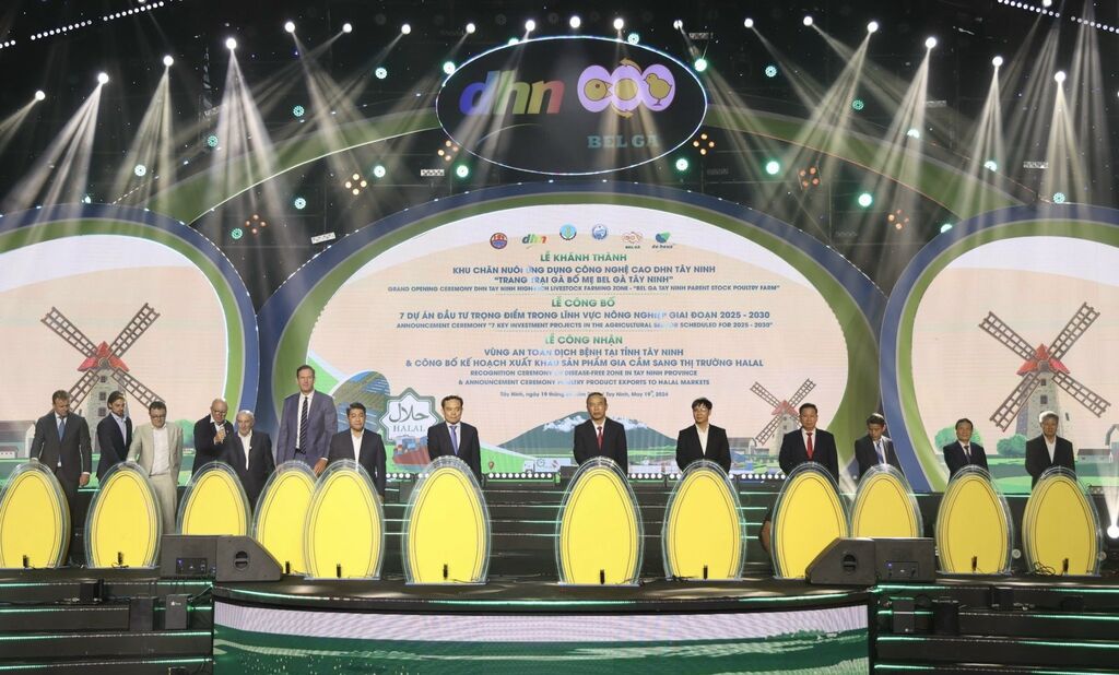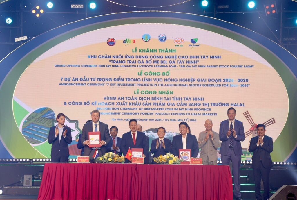 Il s'agit de la cérémonie de remise du certificat de la zone exempte d'épizootie à Tây Ninh, de la cérémonie d'inauguration de la zone d'élevage de haute technologie DHN Tây Ninh, de la cérémonie d'annonce de sept projets clés du complexe de la zone agricole de haute technologie DHN Tây Ninh, et de l'annonce du plan d'exportation de produits de volaille vers le marché Halal.
