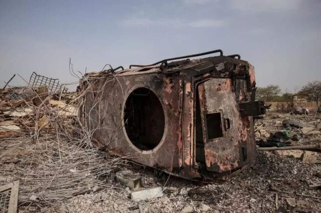 | Un véhicule blindé carbonisé sur le site de l'incendie qui a ravagé le principal dépôt d'armes de l'armée le 18 juin à N'Djamena. |