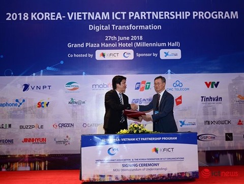 | Vu Thê Binh, vice-président et secrétaire général de la VIA, et Noh Young-kyu, président de la KFICT, lors de la cérémonie de signature tenue le 27 juin à Hanoï. |
