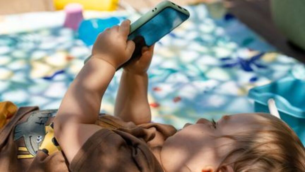 | Un bébé joue avec un téléphone portable, à Port-Vendres (Pyrénées-Orientales). |