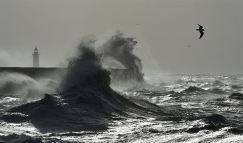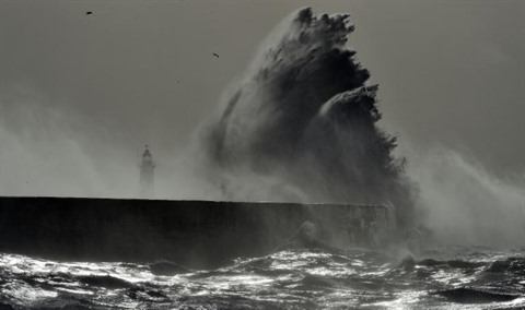 | Des vagues se fracassent sur le phare de Newhaven, sur la côte sud du Royaume-Uni pendant la tempête Doris, le 23 février. |