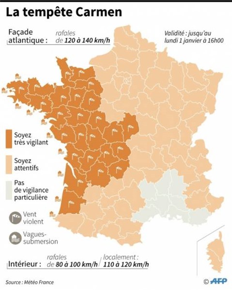 Carmen, qui a commencé à toucher la France lundi matin 1er janvier, est la troisième tempête hivernale après Ana et Bruno en décembre. Les vents ont fait un mort, un homme d'une soixantaine d'années tué dimanche par la chute d'un arbre sur sa voiture près de Saint-Jean-Pied-de-Port, dans les Pyrénées-Atlantiques.