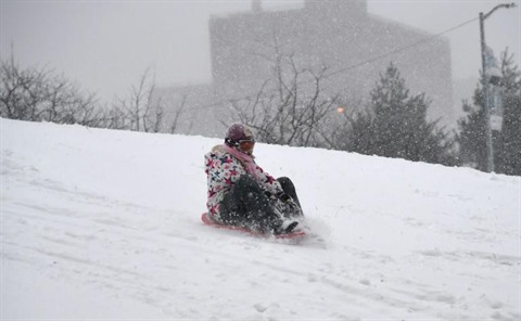 | Les New-Yorkais profitaient de la neige, jeudi 4 janvier, pour faire de la luge dans les rues de Brooklyn. |