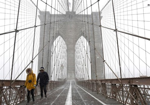 | Des passants bravent le froid sur le pont de Brooklyn à New York, jeudi 4 janvier. |