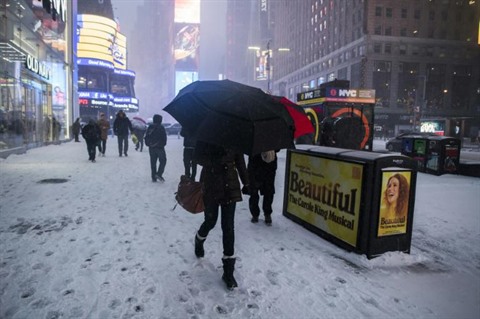 | Des passants sur Times Square enneigé à Manhattan le 4 janvier. |