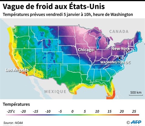 | Carte des températures prévues aux États-unis pour le 5 janvier |