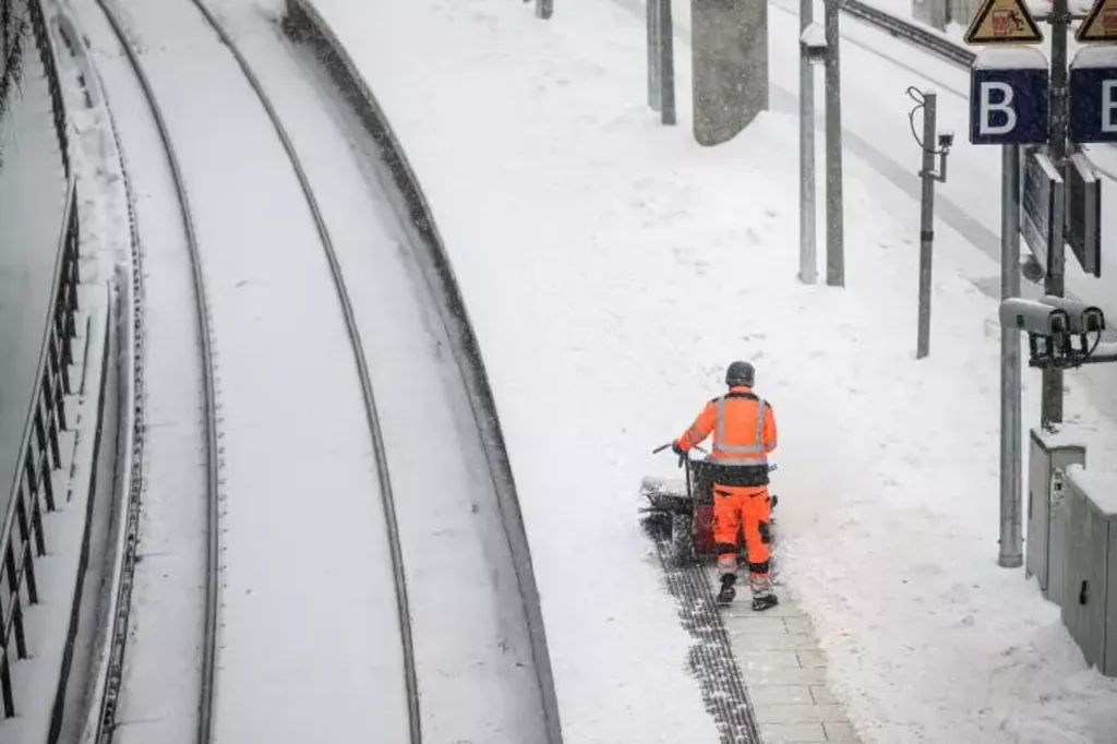 | Un employé déblaye la neige d'un quai de la gare centrale de Hambourg, dans le Nord de l'Allemagne, le 9 janvier 2026. |