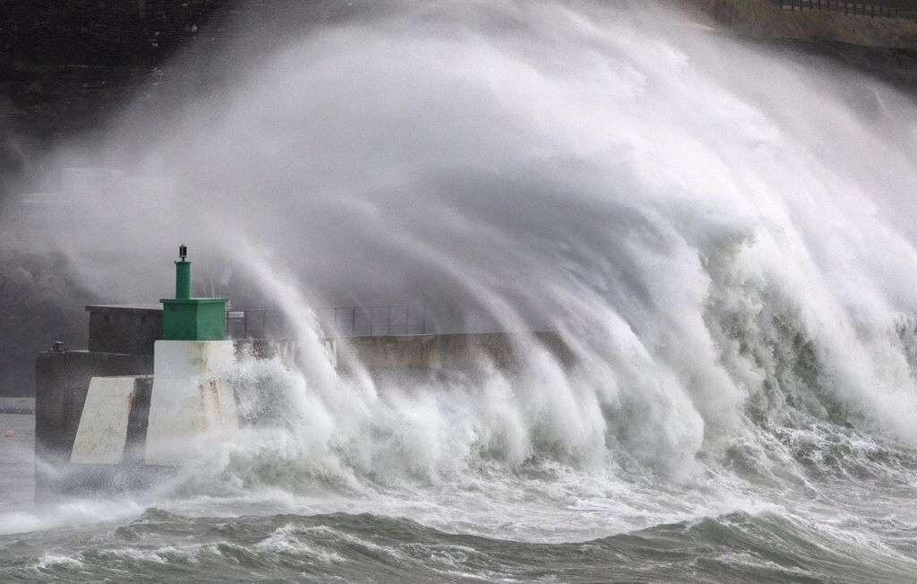 | Une vague giganteesque s'écrase sur la jetée du port du Conquet, en France. |