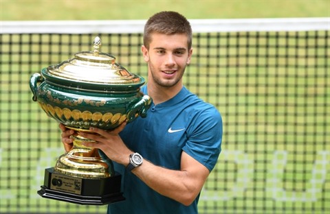 | Le jeune Croate Borna Coric vainqueur de Roger Federer en finale du tournoi de Halle, en Allemagne, le 24 juin. |