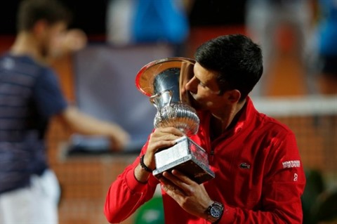 | Novak Djokovic et son trophée de Rome Master, le 21 septembre en Italie. |