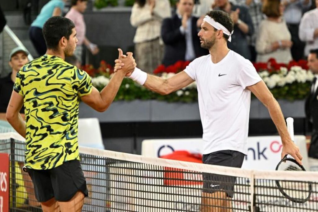 | Carlos Alcaraz (gauche) et Grigor Dimitrov après leur match au tournoi de Madrid, le 30 avril. |