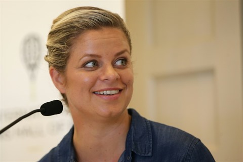 | La Belge Kim Clijsters en conférence de presse à Newport, le 22 juillet 2017. |