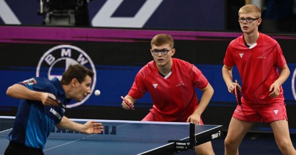 | Les Français Félix Lebrun (droite) et son frère Alexis Lebrun contre l'Autrichien Daniel Habesohn (pas sur l'image) et Robert Gardos (gauche) pendant la demi-finale des Championnats d'Europe de tennis de table à Munich, le 18 octobre 2022. |