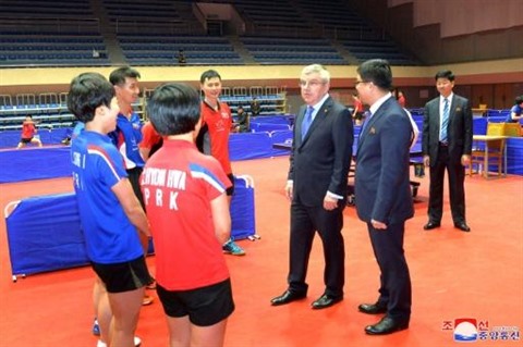 | Le président du CIO Thomas Bach (2e, droite) visite à Pyongyang en République populaire démocratique de Corée un gymnaste dédié au tennis de table, le 1er avril. |