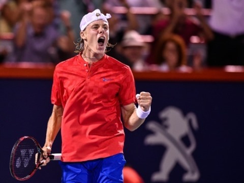 | Le Canadien Denis Shapovalov exulte après sa victoire face au Français Adrian Mannarino en quarts de finale du tournoi de Montréal, le 11 août. |