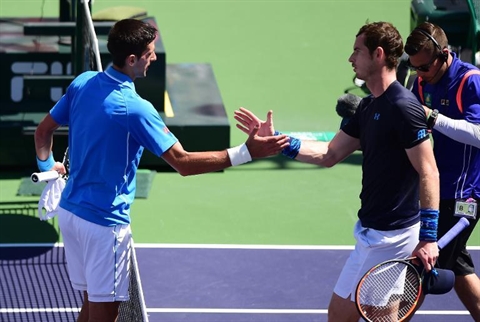 | Le Britannique Andy Murray (gauche) et le Serbe Novak Djokovic se serrent la main à l'issue de leur demi-finale à l'Open de tennis d'Indian Wells, en Californie, le 21 mars. |