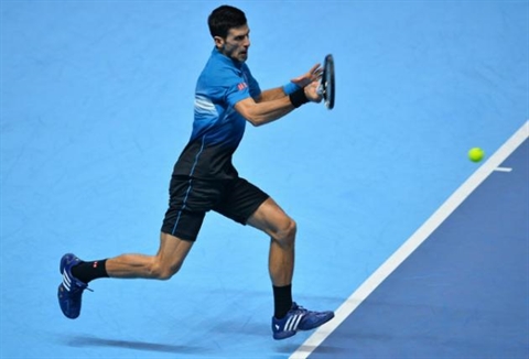 | Le Serbe Novak Djokovic affronte le Japonais Kei Nishikori lors du Masters final, le 15 novembre à Londres. |