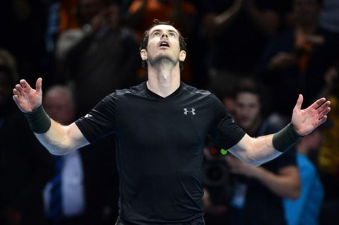 | Le Britannique Andy Murray fête sa victoire face au Canadien Milos Raonic au Masters à Londres, le 19 novembre 2016. |