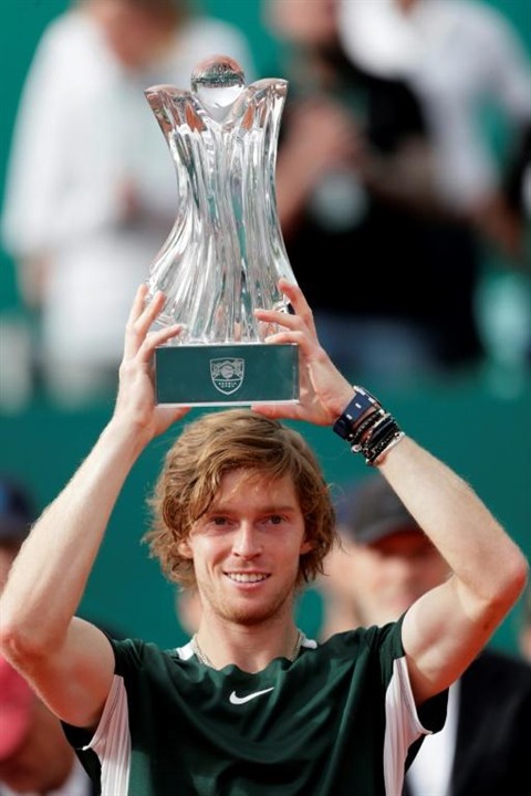 | La joie du Russe Andrey Rublev, après avoir remporté la finale du tournoi sur terre battue de Belgrade, le 24 avril. |