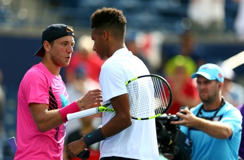 | Lucas Pouille (gauche) congratule le Canadien Felix Auger-Aliassime, vainqueur du Français au 1er tour du Masters 1.000 de Toronto, le 7 août. |