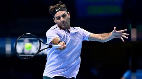 | Le Suisse Roger Federer retourne face à l'Allemand Alexander Zverev lors du Masters, le 14 novembre 2017 à Londres. |