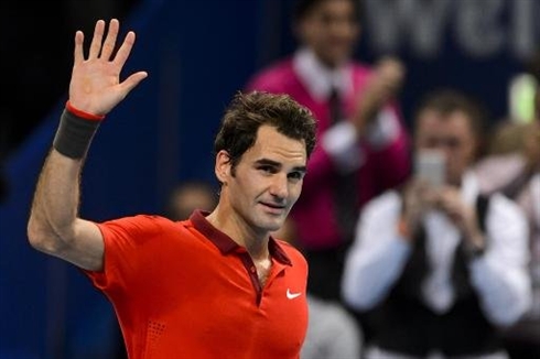 | Roger Federer après sa victoire contre Grigor Dimitrov, à Bâle le 24 octobre 2014 |