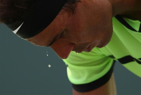 | L'effort de Rafael Nadal lors de la finale du Masters 1000 de Miami face à Roger Federer, le 2 avril à Key Biscayne. |