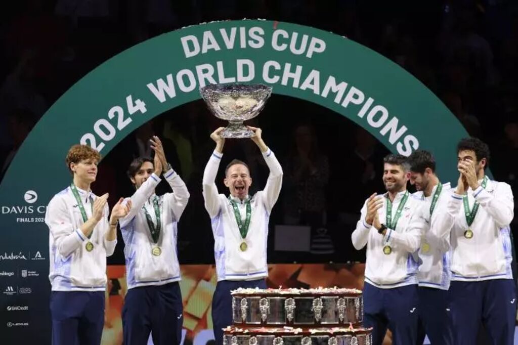 | Le capitaine de l'Italie Filippo Volandri soulève le Saladier d'argent après la victoire de son équipe dans la Coupe Davis 2024 à Malaga en Espagne. |