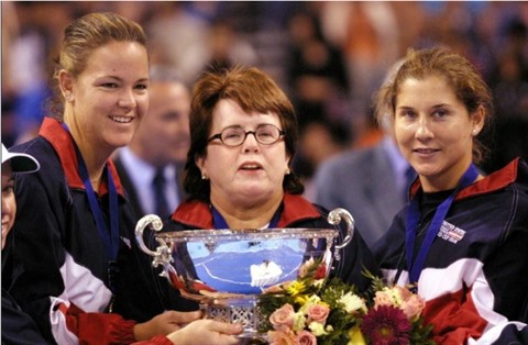 | La légende du tennis Billie Jean King vainqueure de dix Fed Cups, en tant que capitaine, est entourrée ici par Lindsay Davenport (gauche) et Monica Seles après leur succès sur l'Espagne, le 25 novembre 2000 à Las Vegas. |