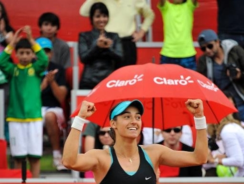 | La Française Caroline Garcia fête sa victoire contre Jelena Jankovic, le 13 avril |