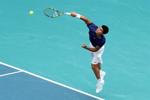 | Le prodige du tennis espagnol Carlos Alcaraz au service face à Casper Ruud à Miami, le 3 avril. |