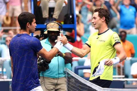 | Accolade entre le prodige espagnol Carlos Alcaraz et le Norvégien Casper Ruud à l'issue de leur match à Miami, le 3 avril. |
