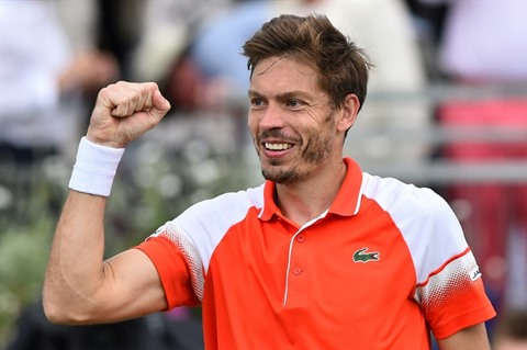 | Le Français Nicolas Mahut vainqueur du Suisse Stan Wawrinka au 2e tour du tournoi du Queen's, le 20 juin à Londres. |
