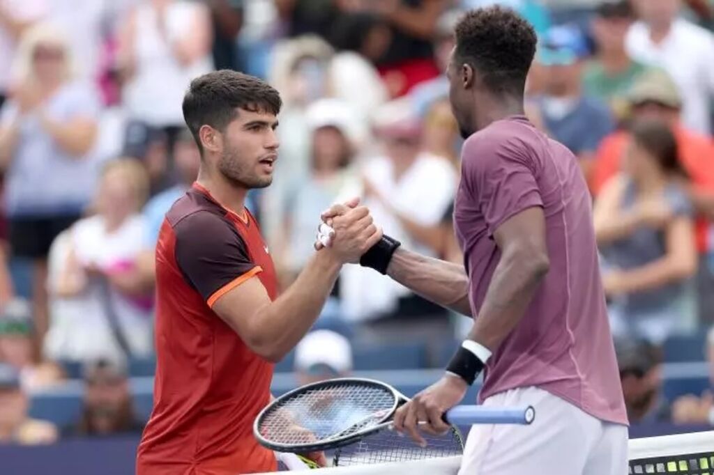 | Carlos Alcaraz (gauche) et Gaël Monfils à l'issue de leur match à Cincinnati, le 16 août. |