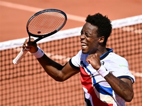 | La joie du Français Gaël Monfils, après avoir battu l'Espagnol Albert Ramos-Vinolas, lors du 1er tour du tournoi de Roland-Garros, en juin 2021 |