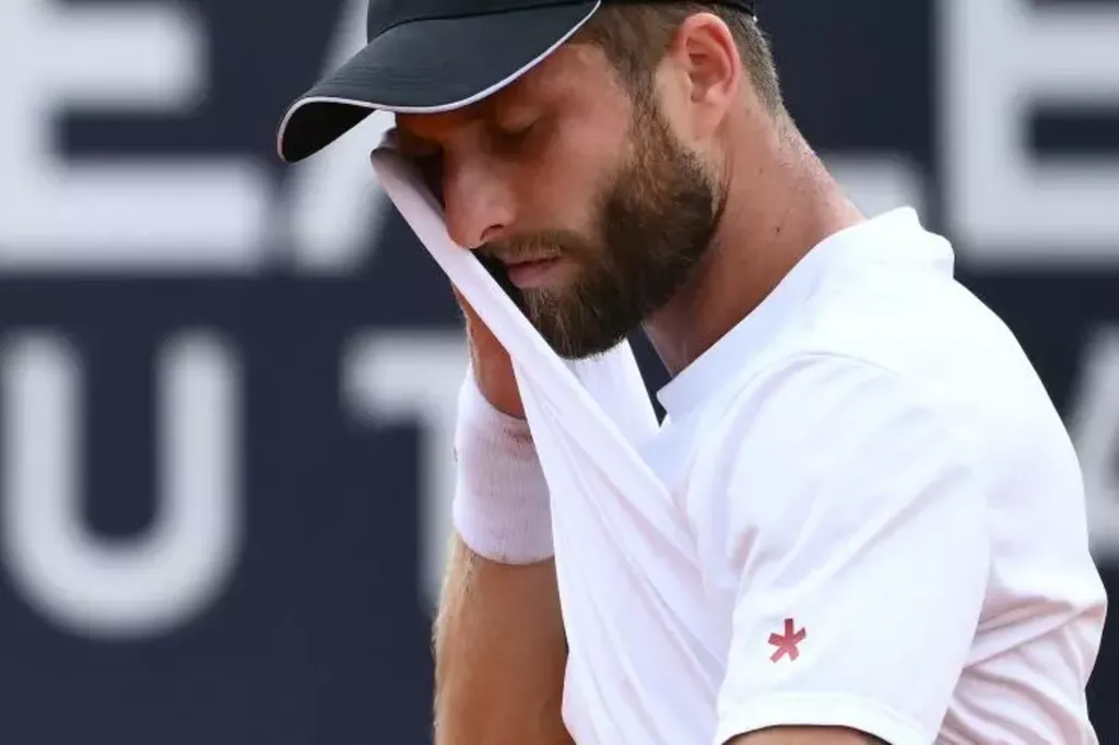 | Le Français Corentin Moutet lors de son 8e de finale du Masters 1000 de Rome face au Britannique Jack Draper le 13 mai. |